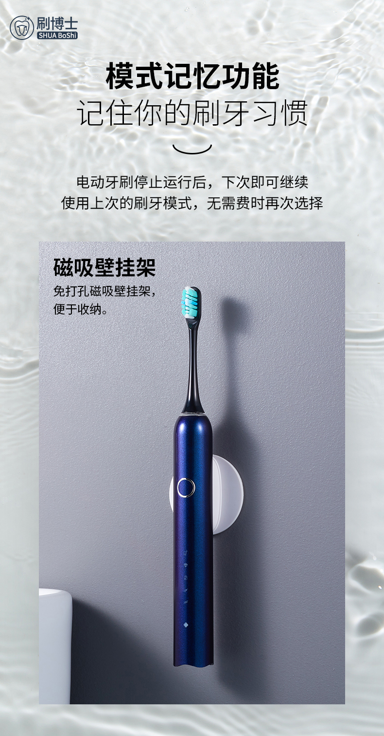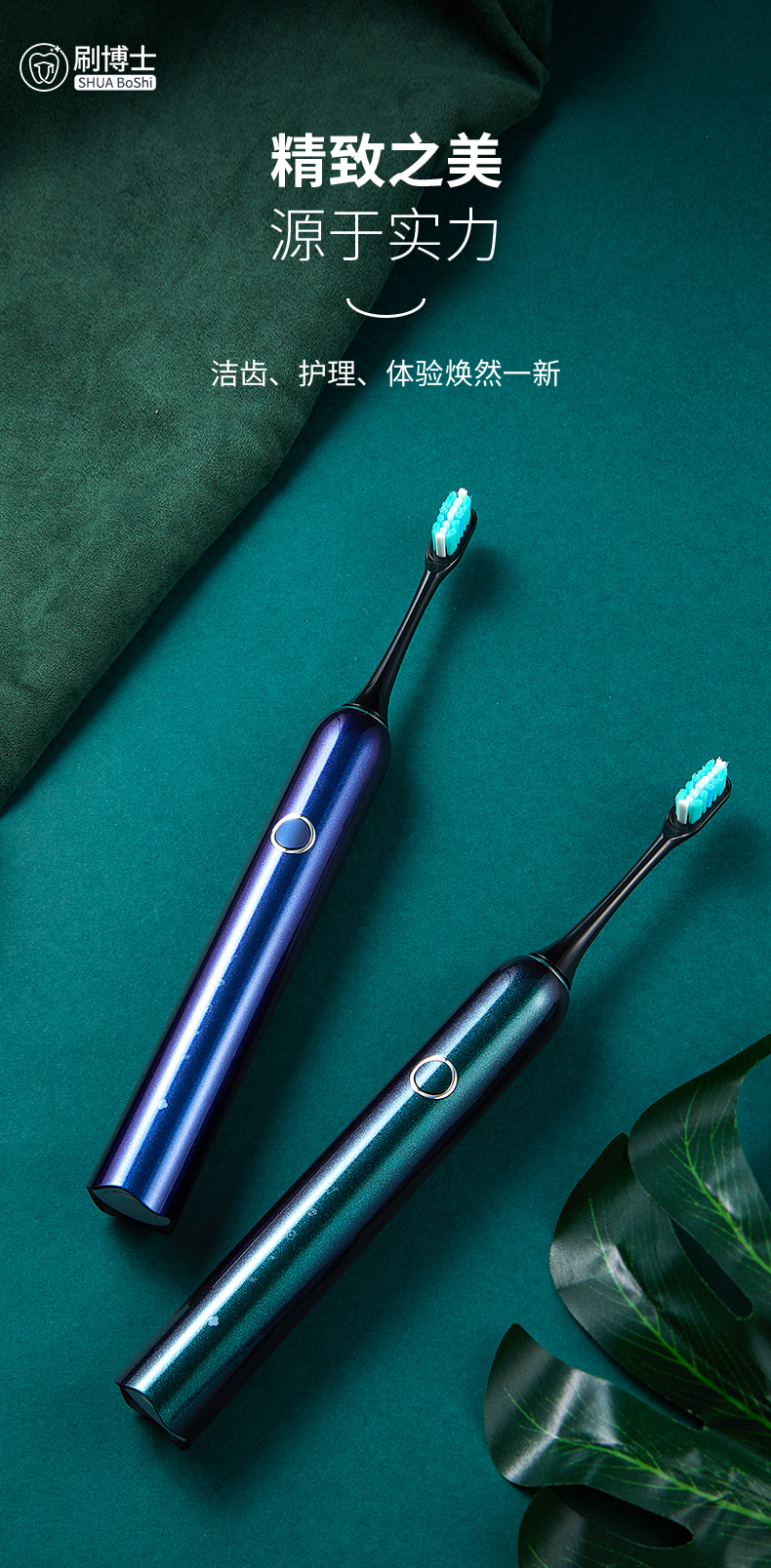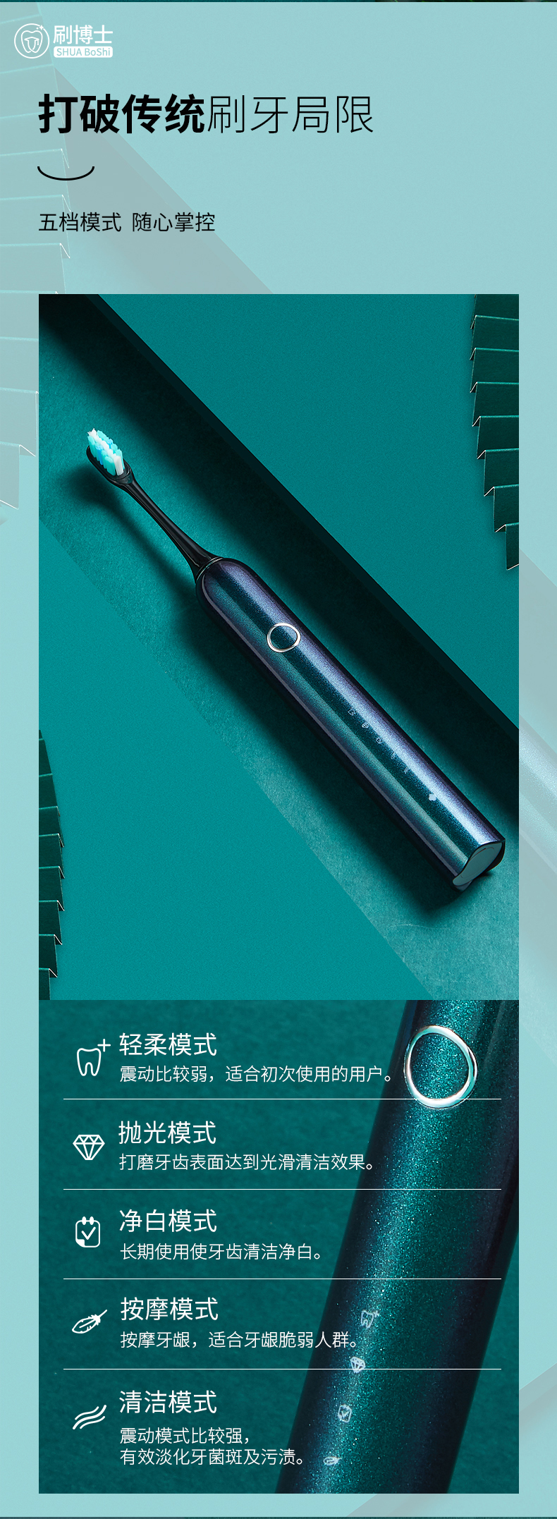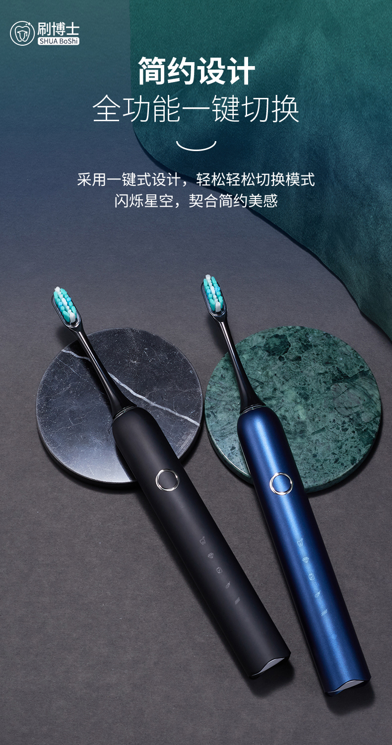 刷博士【S300智能聲波電動牙刷】是一款集潔齒、護理及體驗煥然一新于一身的多功能聲波電動牙刷,采用一鍵式的簡約設計,5檔清潔模式,隨心掌控;此外,植入了模式記憶功能,牢牢記住你的刷牙習慣,下次刷牙,無需費時再次選擇;強勁的續航功能,一年僅充1次電;高顏值的顏色設計,皓月白、睿智黑、深邃藍等多種顏色選擇,遇上不同風格的你。