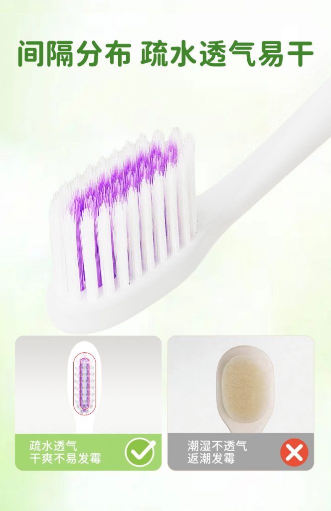 2、潔凈透氣:間隔分布疏水刷面,深入清潔齒縫,透氣易干,減少細菌滋生,告別返潮發霉。